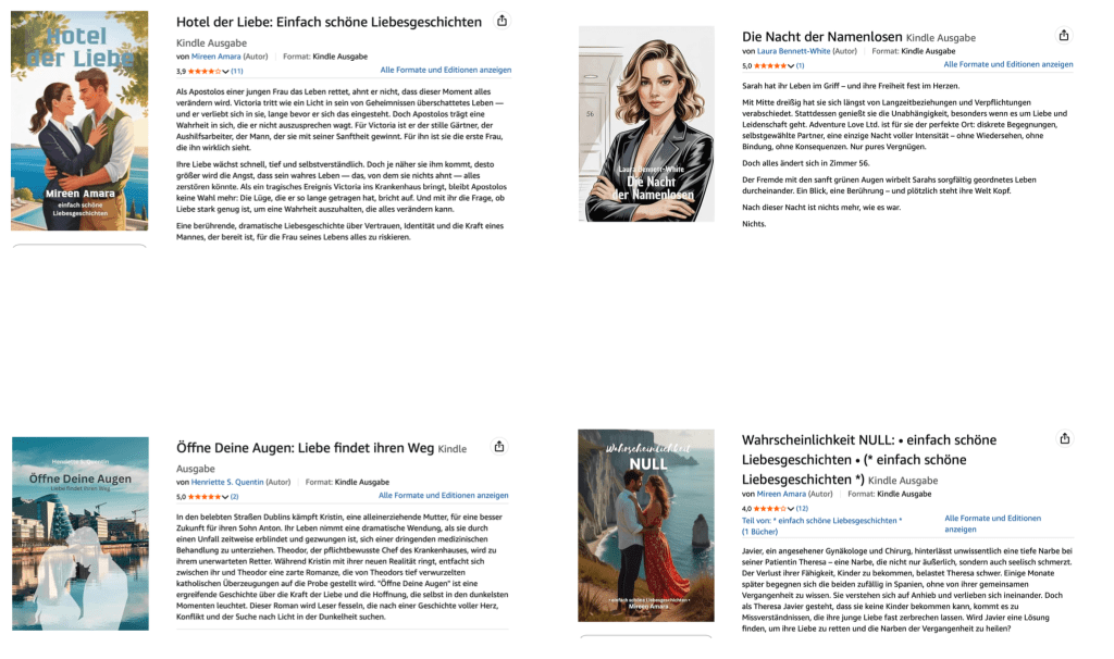 Mireen Amara, Laura Bennett-White und Henriette S. Quentin aus der Autor:innenkooperative Wortfabrik schreiben genau aus diesem Grund: Sie möchten emotionale Wärme schenken, Trost spenden und immer wieder ein Lächeln hervorrufen. Jede von ihnen bringt dabei eine eigene Facette des Heft- und Kurzromans ein. Henriette ist diejenige, die die meisten Seiten füllt – ihre Geschichten führen die Leser:innen in Welten voller Herausforderungen, in denen ihre Figuren Mut beweisen und über sich hinauswachsen müssen. Mireen bewegt sich in einem ähnlichen Genre, doch wer eine Geschichte „für zwischendurch“ sucht, ist bei ihr genau richtig. In maximal hundert Seiten entführt sie ihre Leser:innen an Orte voller Liebe und Leidenschaft: nach Spanien oder Griechenland, nach Bremen oder in das Reich der Ritter und Könige. Ihr neuestes Werk trägt den Titel Hotel der Liebe.