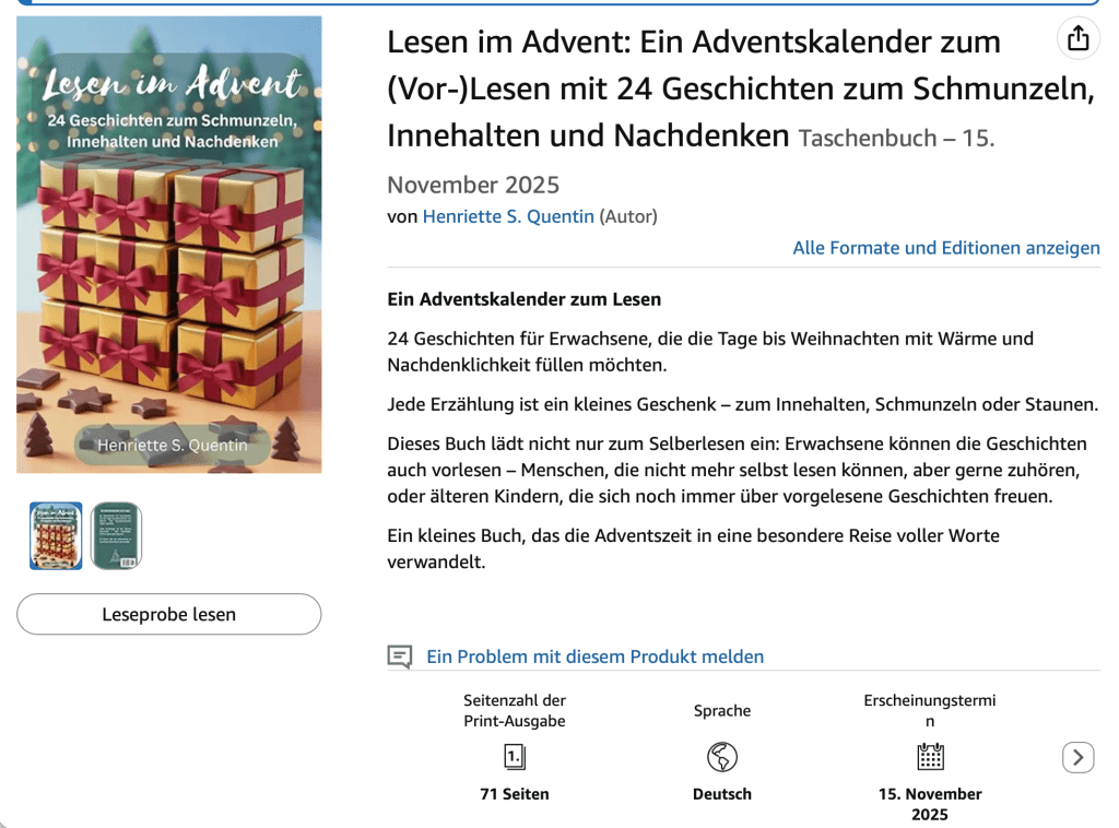 Die Adventszeit ist voller kleiner Rituale, die Wärme und Geborgenheit schenken. Mit „Lesen im Advent“ hat Henriette S. Quentin einen literarischen Kalender geschaffen, der Erwachsene dazu einlädt, jeden Tag innezuhalten und sich eine kleine Geschichte zu gönnen.